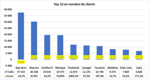 La zone Caraïbes conserve sa place de première destination en trafic, suivie de très près par la zone Afrique/Océan Indien en forte progression.