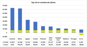 Le Maroc (+379,7%), l'Égypte (+84%) et la Tunisie (+85,6%) retrouvent leurs places de destinations leaders, occupant les premiers rangs du TOP 10 juste derrière les Canaries (stables).