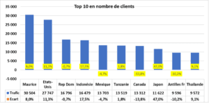 L'île Maurice reste en tête (+8%), suivie des États-Unis (+11,3%). Forte reprise en Asie (+28% en trafic). La République Dominicaine revient en troisième position.