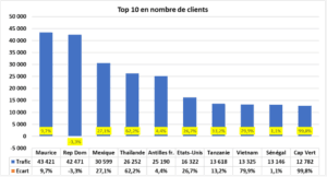 L'île Maurice passe en tête du classement (+9,7%), dépassant la République Dominicaine qui atténue sa baisse (-3,3%), devant le Mexique (+27,1%). La Thaïlande poursuit sa croissance (+62,2%) en 4ème position. Le Vietnam fait son retour dans le TOP 10 (+79,9%).